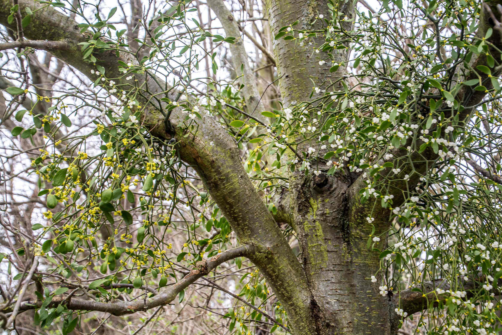 Wenn man im Februar durch einen kahlen Obstgarten oder einen lichten Wald spaziert, fallen die Misteln sofort auf: grüne Kugeln, die hoch oben in den Ästen sitzen. Was man kaum sieht, sind die winzigen Blüten, die sich zu dieser Zeit öffnen. Sie sind nur wenige Millimeter großund gelblich-grün – unscheinbar, aber erstaunlich gut an das Leben im Winter angepasst.