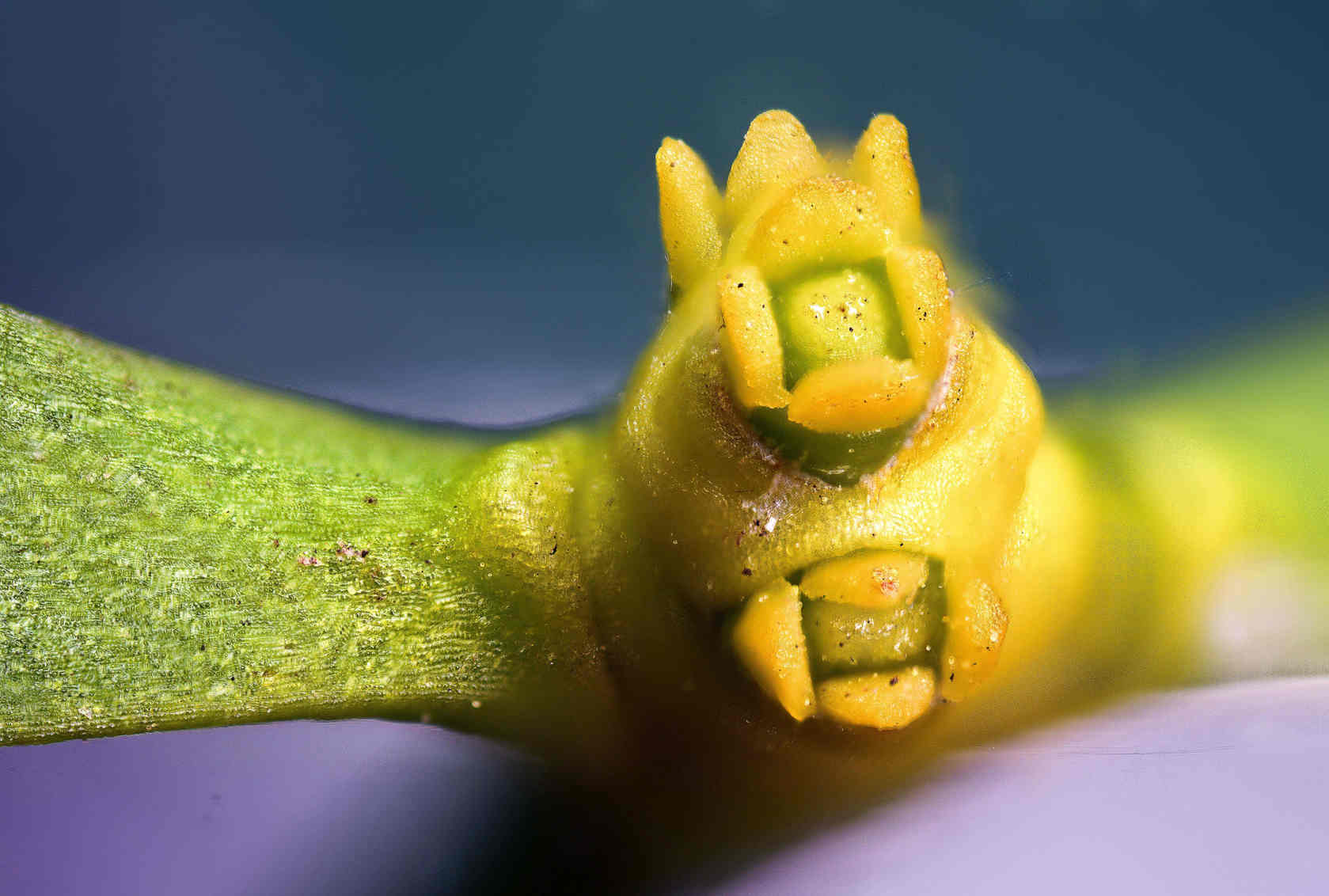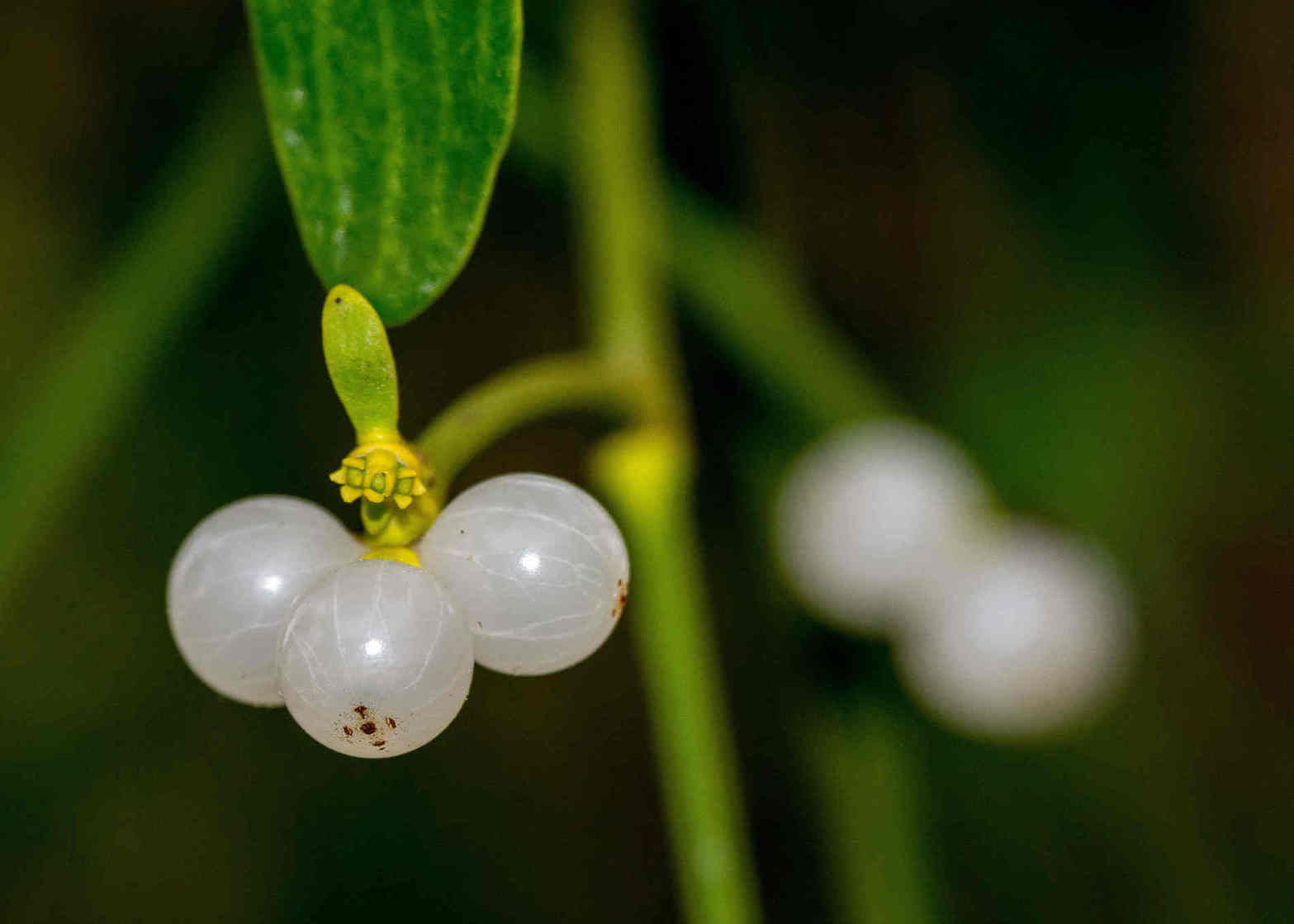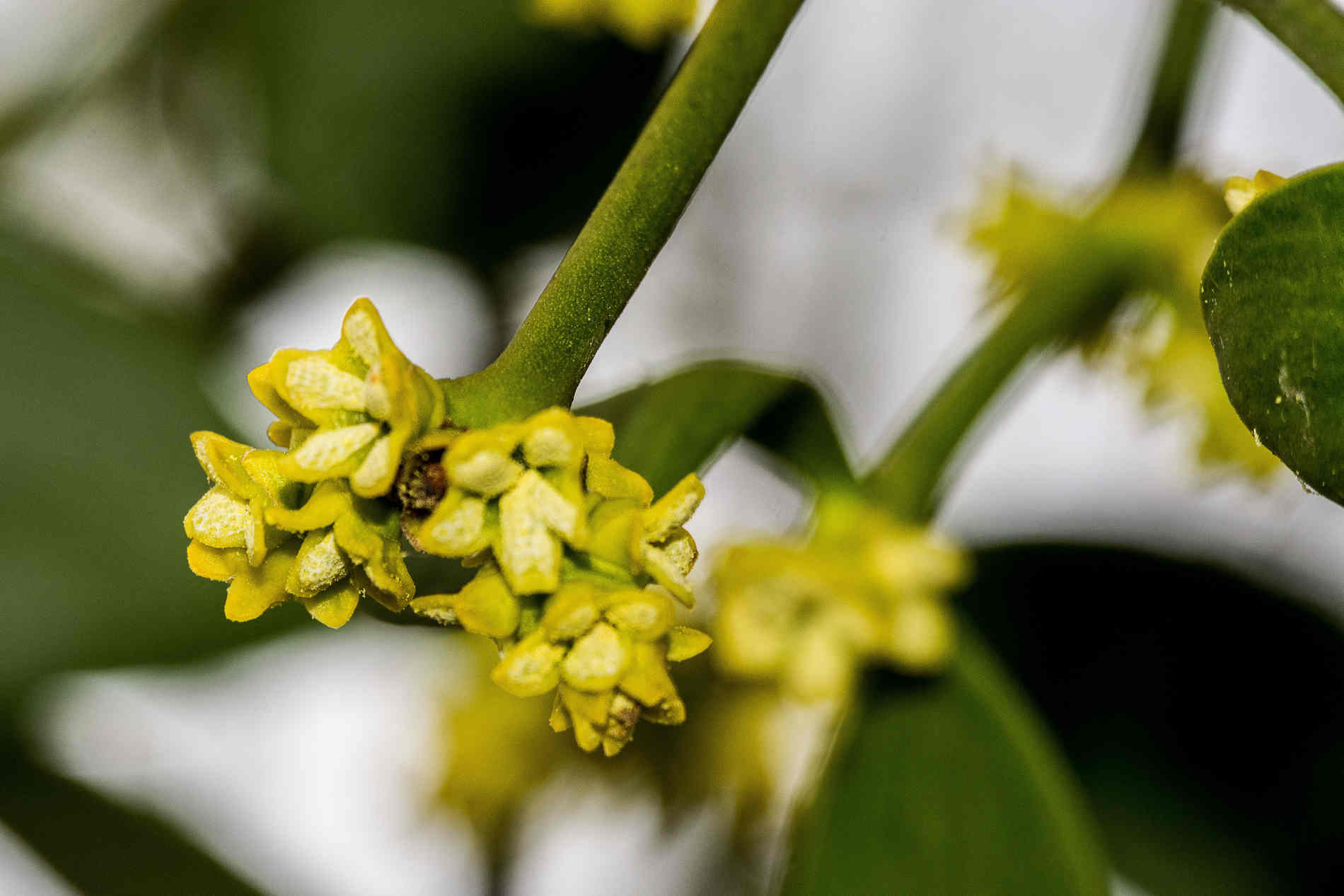 Weibliche Misteln besitzen eine einfache Blüte, die darauf wartet, bestäubt zu werden. Trotz ihrer Schlichtheit erfüllen die Blüten eine wichtige Aufgabe: Sie sorgen dafür, dass im Herbst die typischen weißen Mistelbeeren entstehen.