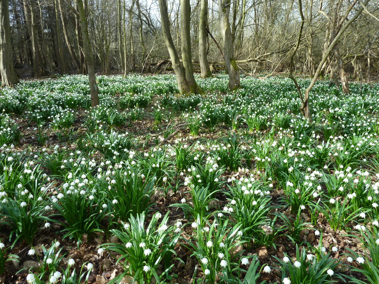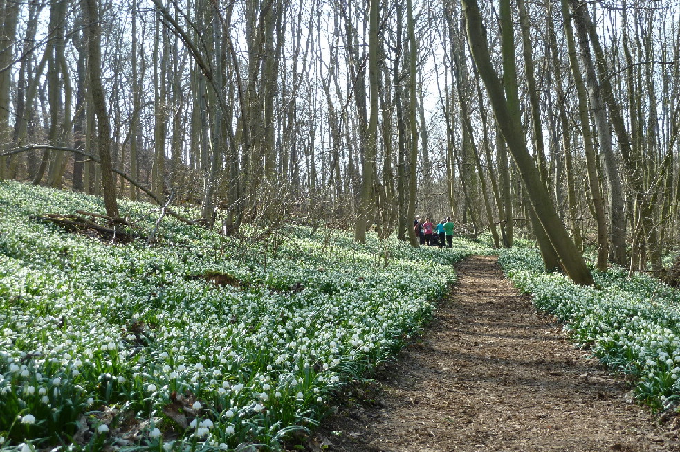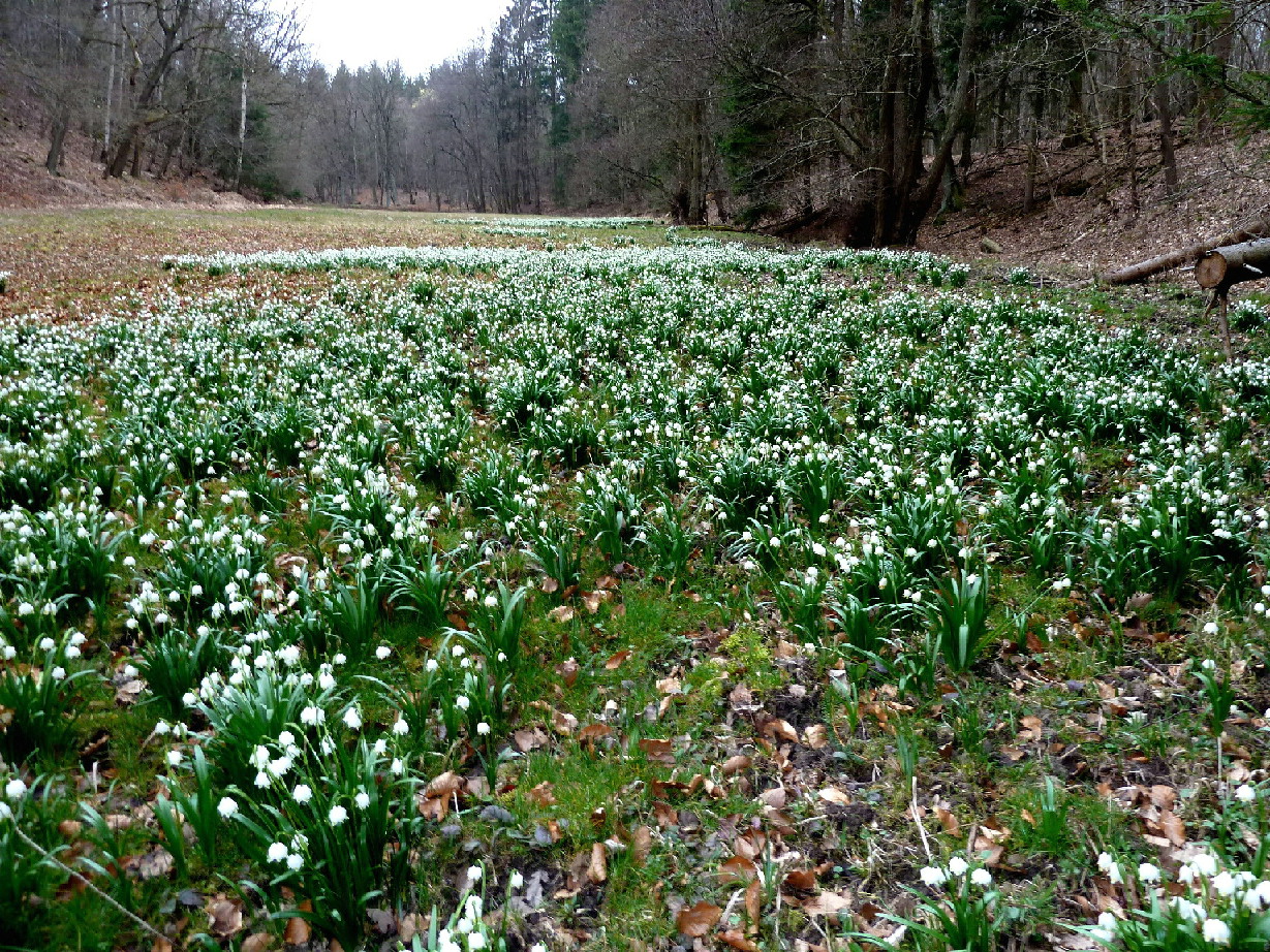 Der Name sagt es – ab Anfang März verkündet der einheimische Märzenbecher( Leucojum vernum – er gehört aus botanischer Sicht zu den Narzissen-Gewächsen) den Start in den Frühling. Im Bereich der nordöstlichen Harzkante gibt es eine Reihe von Vorkommen dieses prächtigen Blumenzwiebelgewächses. Am bekanntesten davon ist das Vorkommen im Zehling – einer naturgeschützten Waldinsel in der Nähe der Ballenstedter Gegensteine. Dieser Bestand, der sich immer noch in Ausbreitung befindet, ist der flächengrößte der Region. Die vielen tausend weißen Blütenbecher bieten vor allem bei Frühlingssonne ein prägendes einmaliges Naturerlebnis. Es ist gut, dass für die zahlreichen Besucher extra ein Parkplatz eingerichtet wurde. Negativ ist anzumerken, dass der schmale Pfad durch das Blütenmeer immer breiter ausgetreten wird.