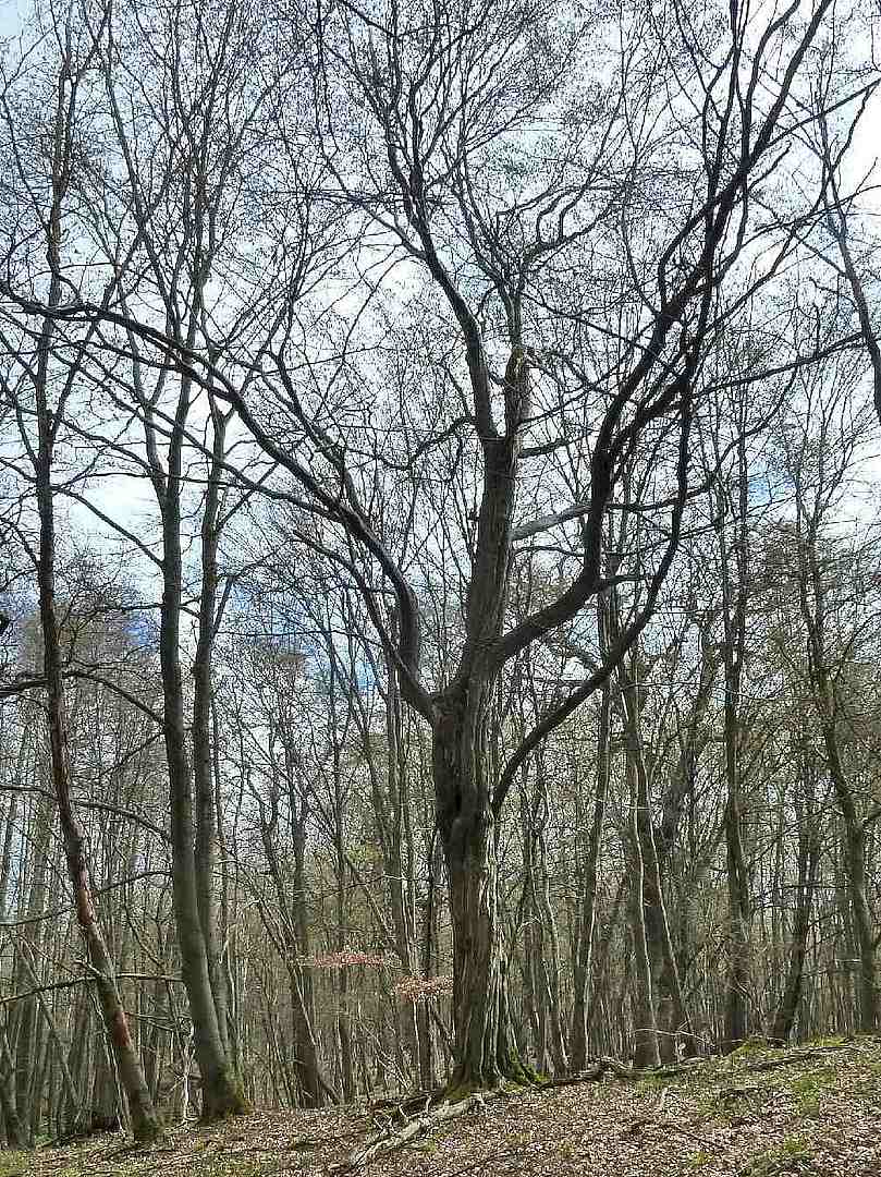 Nur vereinzelt waren diesem Bestand Hainbuchen beigemischt. 1947 wurden als Reparationsleistung bis auf wenige einzelne Bäume alle großen Eichen in diesem Waldbereich gefällt. Nicht gefällt wurden offensichtlich die wenigen vorhandenen Weißbuchen. Diese haben in den zurückliegenden rund 75 Jahren für reichlich Naturverjüngung gesorgt. Der einstige Eichenwald hat sich zu einem artreinen dichten Weißbuchenwald entwickelt. Die einstigen Altbäume sind heute fast alle abgängig. Dies gilt auch für die wenigen Eichen, die schon als Starkbäume die