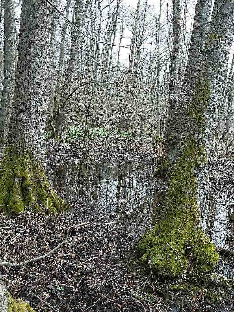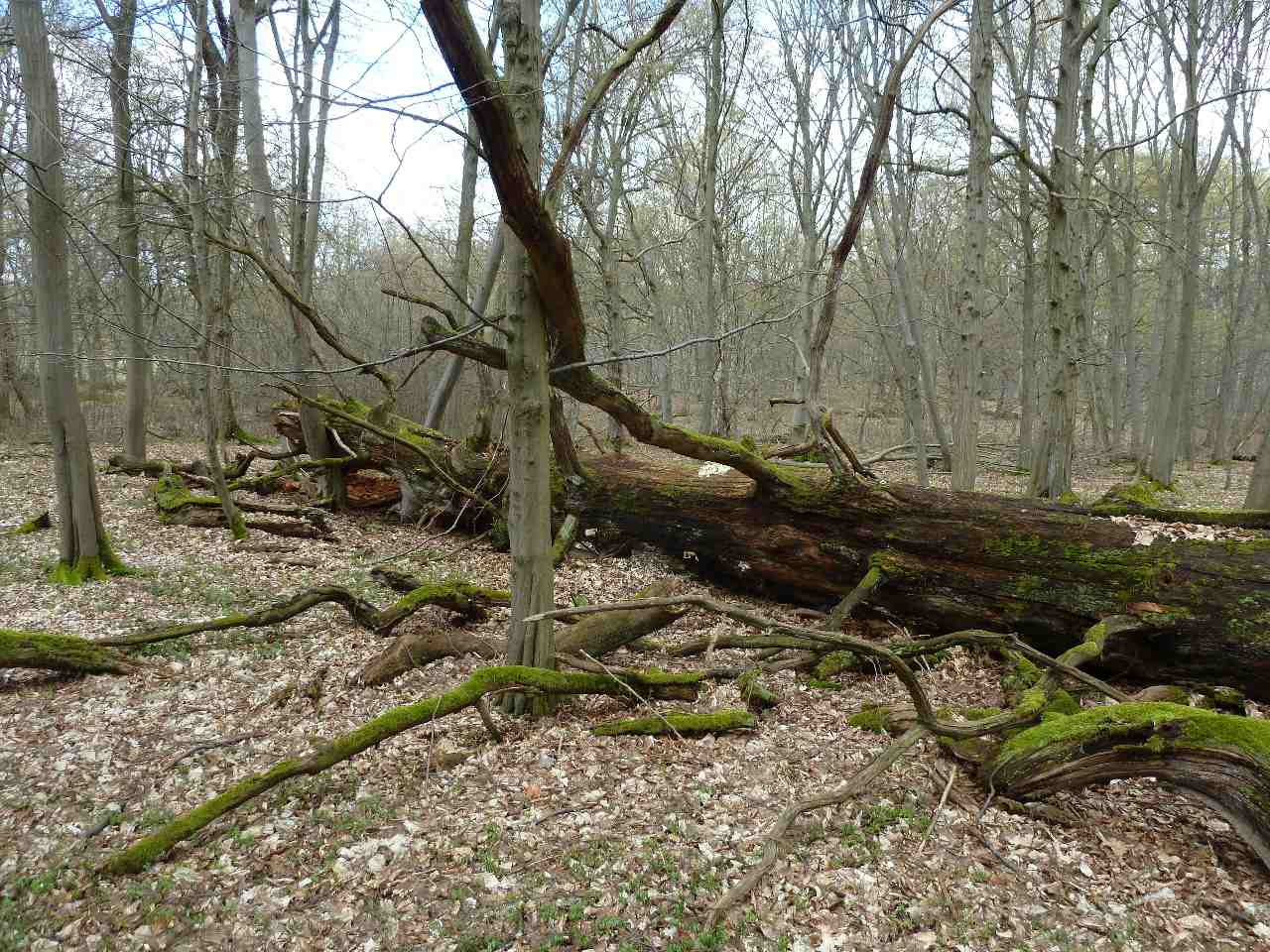 Die umgefallenen und langsam verwitternden Baumriesen prägen ein verwunschenes Waldbild Unverständlich bleibt, weshalb die einzelnen großen Eichen keine Nachkommenschaft produziert haben, bwohl nach dem Fällen des Eichenbestandes je zunächst ein ganz lichter Wald entstanden sein muss. In den östlichen Waldbereichen sind über einen längeren Zeitraum hinweg Rotbuchen in das Waldmassiv eingewandert, hier war wohl schon immer die Traubeneiche keine dominierende Baumart. In kleinflächigen Bereichen mit Staunässe sind reine Erlenbestockungen zu finden. Fast immer sind diese mit individuenreichen Märzenbecherbeständen verbunden.