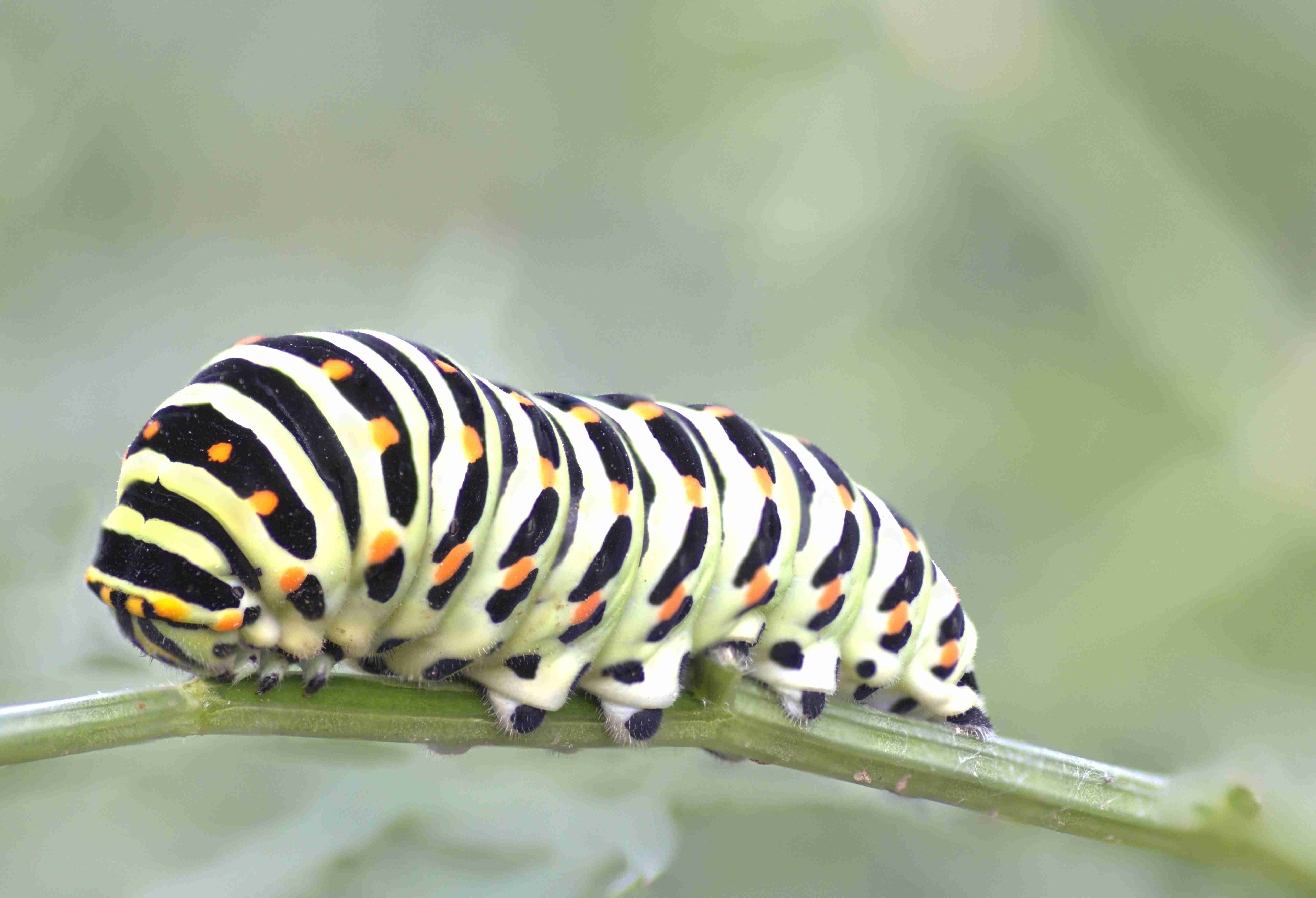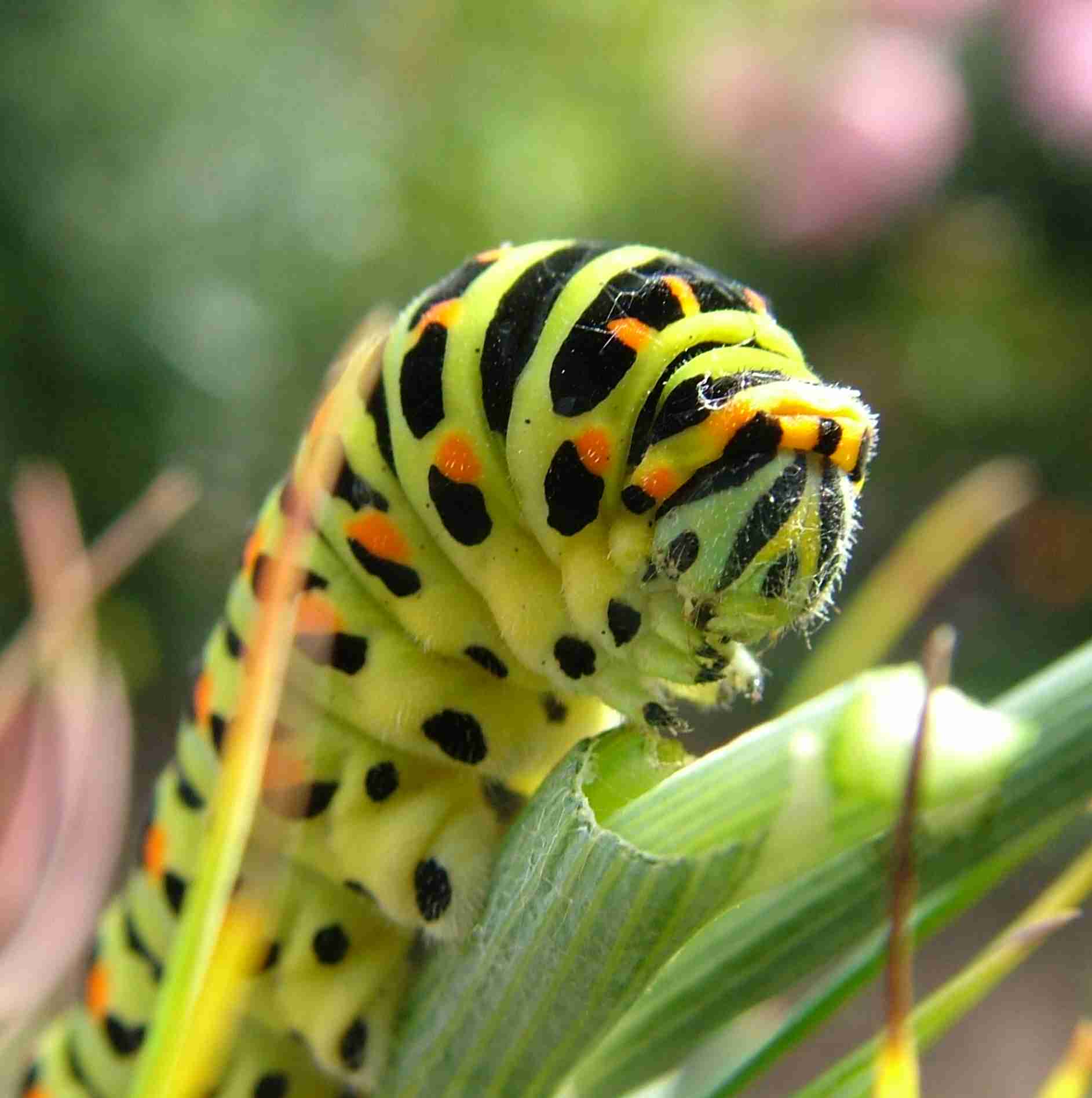 Die Raupen durchlaufen mehrere Häutungen. Die jungen Raupen sind dunkel gefärbt, mit orangenen Punkten und einem weißen Sattelfleck in der Körpermitte. Dasist eineTarnfärbung mit der ein Klecks Vogelkot vorgetäuscht wird. Bei älteren Raupen sind grün gefärbt, mit schwarzen Querstreifen, auf denen sich gelbe und orangene Punkte befinden. Bei Bedrohung können die Raupen eine orangene Nackengabel ausstülpen, die einen Duftstoff absondert und Fressfeinde, wie z.B. Ameisen, abschrecken soll. Die Raupen verpuppen sich als Gürtelpuppe, aus denen im Sommer nach 2 bis 3 Wochen die Falter schlüpfen.