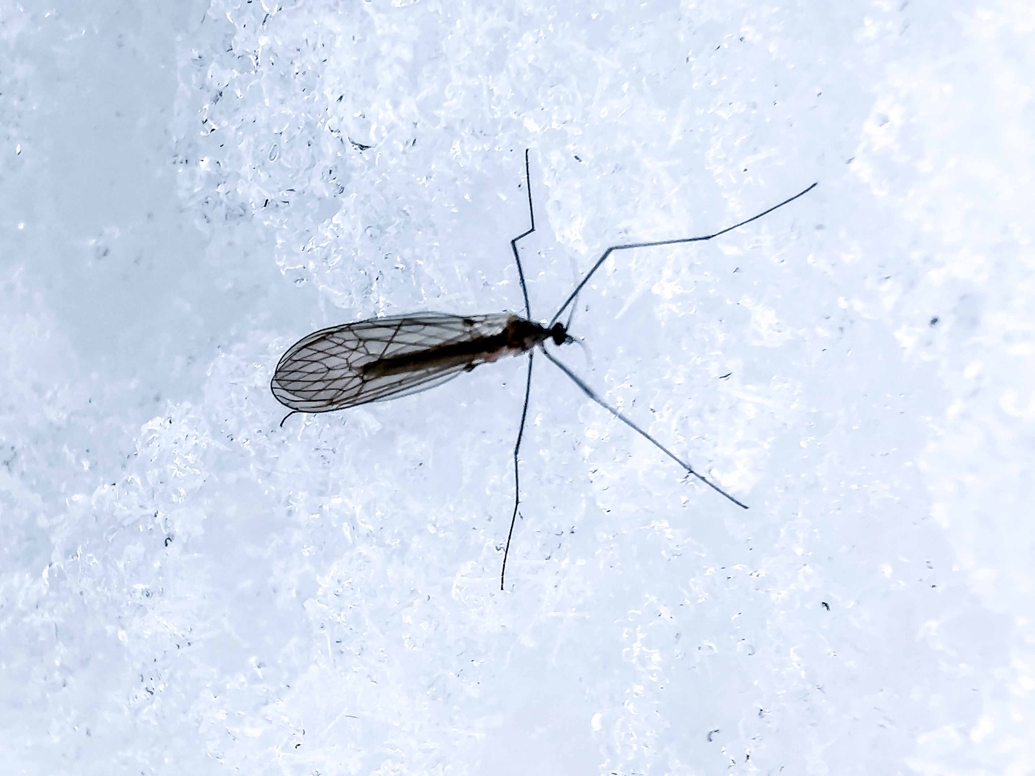 Beim näheren Hinschauen erkennt man zarte, schlanke Mücken, Wintermücken genannt. Die Wintermücken aus der Familie der Trichoceridae sind erstaunlicherweise unempfindlich gegen Kälte und noch bei 0° C aktiv. Frostschutzmittel ähnliche Substanzen in ihren Zellen verhindern, dass die Körperflüssigkeit gefriert und ermöglicht noch ein Leben kurz über dem Gefrierpunkt.