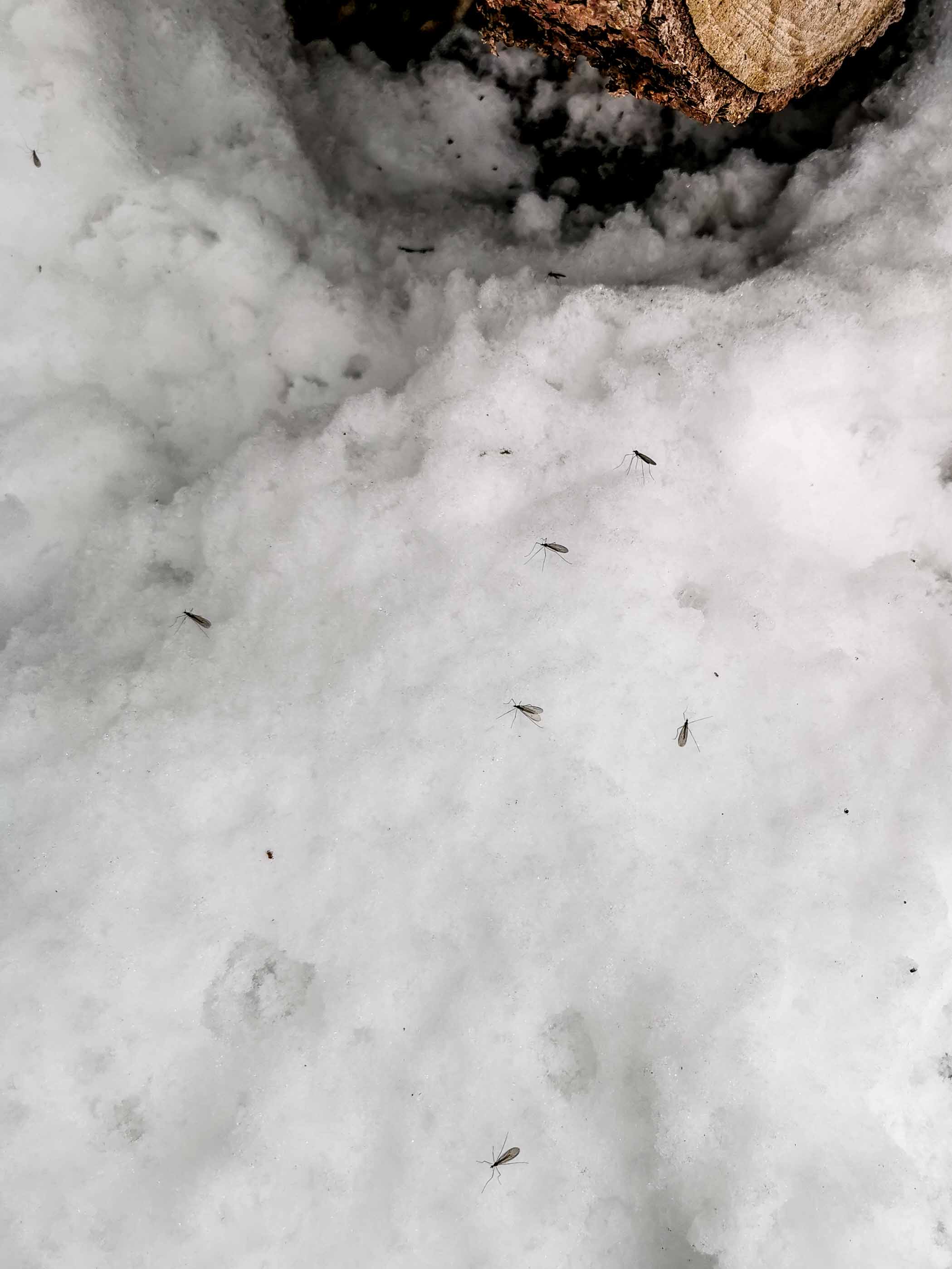 Das Land ist mit Schnee bedeckt, vorbei ist das Summen und Zirpen der Insekten. Doch nicht alle Insekten sind verschwunden. Auf der Schneedecke tanzen kleine, dunkle InsektenWintermuecke 002.