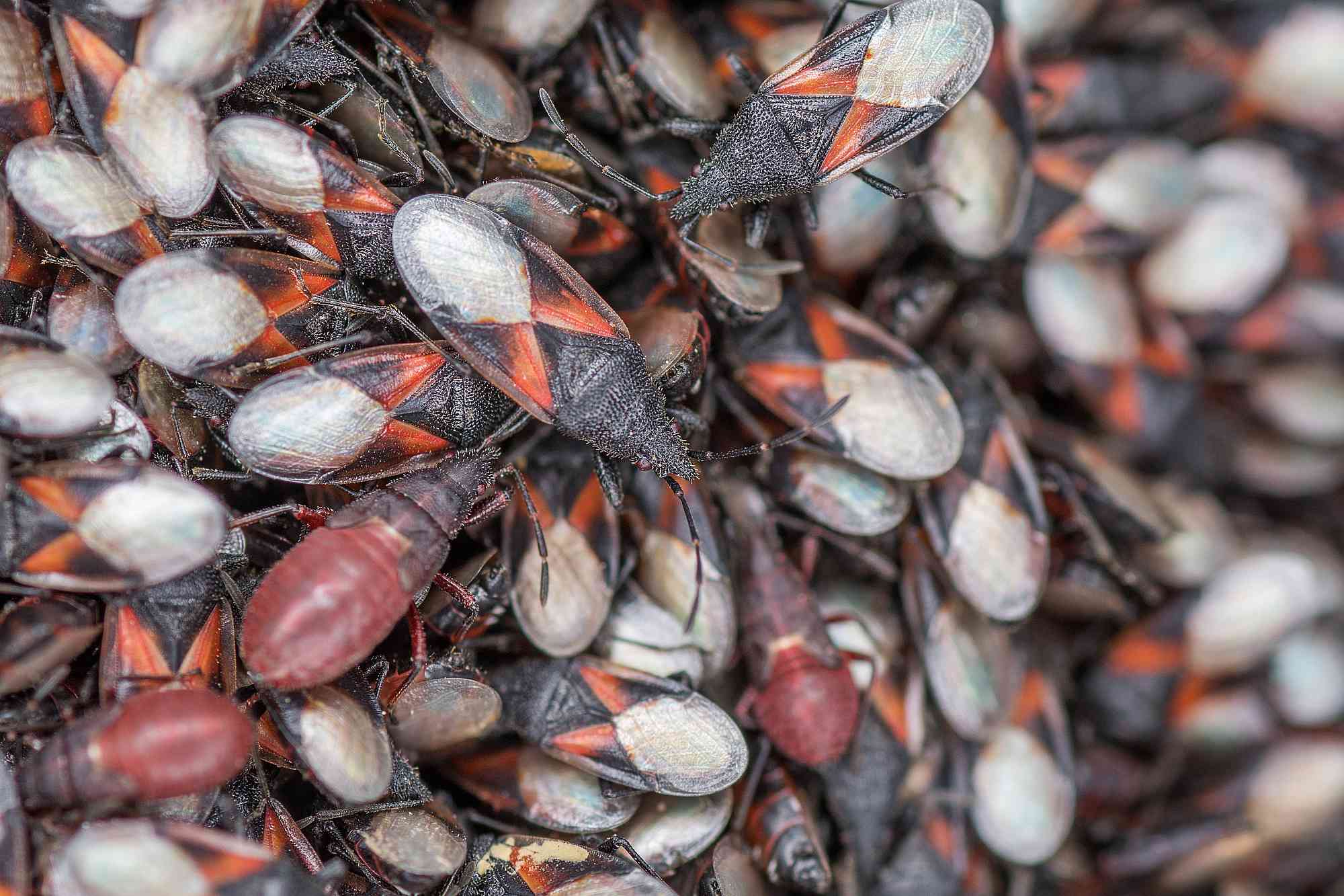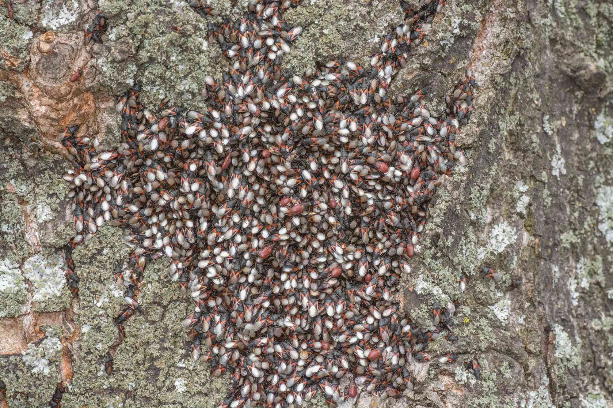 Eine besondere Eigenart der Lindenwanzen O. lavaterae ist die Überwinterung der erwachsenen Tiere sowie auch der älteren Larven in großen Massenansammlungen an den Stämmen von Lindenbäumen. Dies als „Plaque“ bezeichneten, auffälligen Ansammlungen (Abb. 5) können, wie an verschiedenen Bäumen im Stadtgebiet zu beobachten ist, tausende von Tieren umfassen!