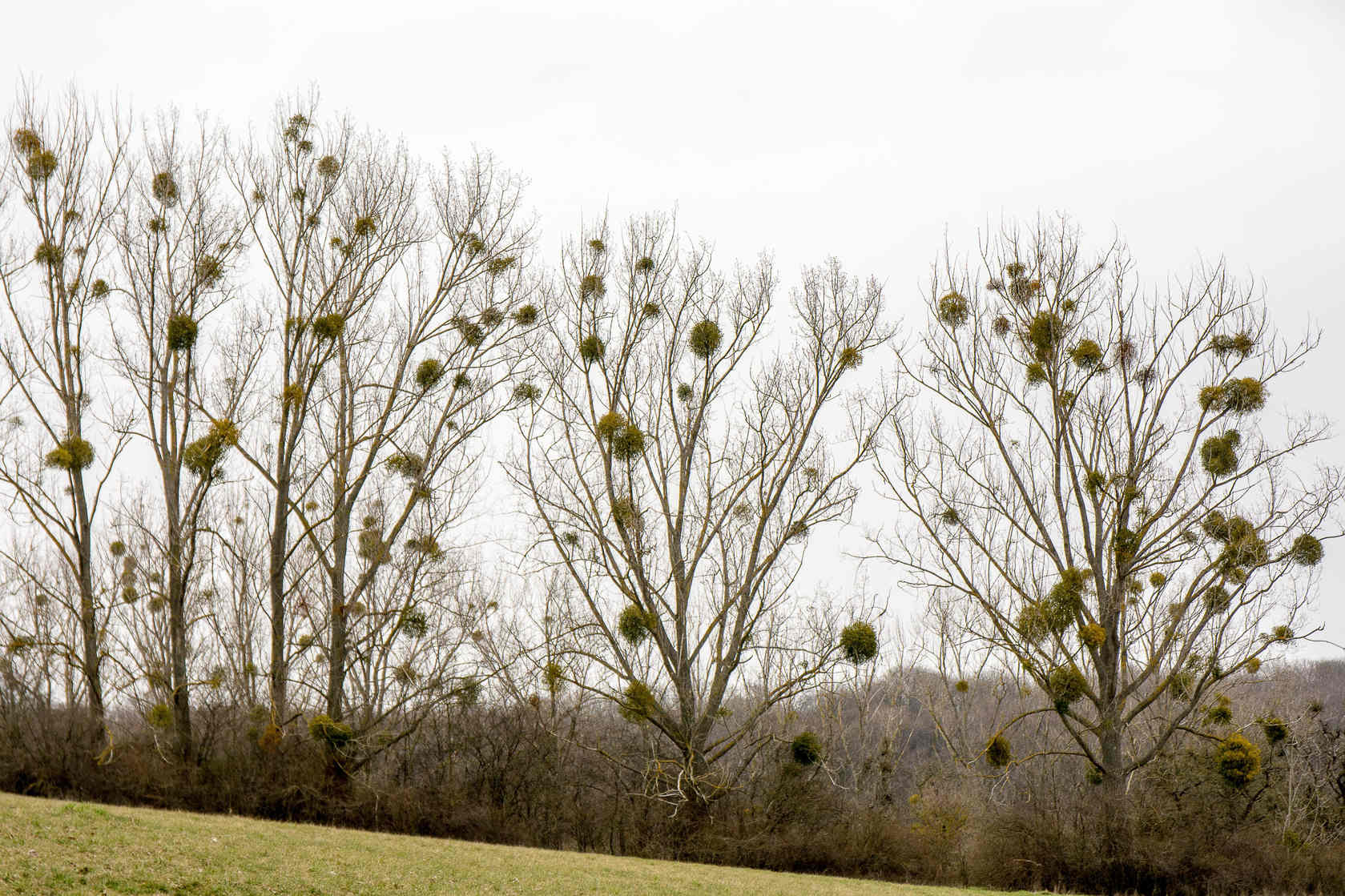 Wenn man im Februar durch einen kahlen Obstgarten oder einen lichten Wald spaziert, fallen die Misteln sofort auf: grüne Kugeln, die hoch oben in den Ästen sitzen. Was man kaum sieht, sind die winzigen Blüten, die sich zu dieser Zeit öffnen. Sie sind nur wenige Millimeter großund gelblich-grün – unscheinbar, aber erstaunlich gut an das Leben im Winter angepasst.