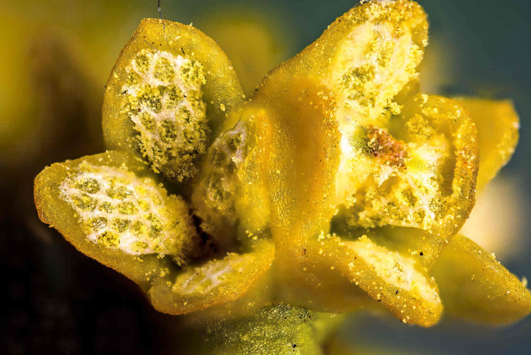 Weibliche Misteln besitzen eine einfache Blüte, die darauf wartet, bestäubt zu werden. Trotz ihrer Schlichtheit erfüllen die Blüten eine wichtige Aufgabe: Sie sorgen dafür, dass im Herbst die typischen weißen Mistelbeeren entstehen.
